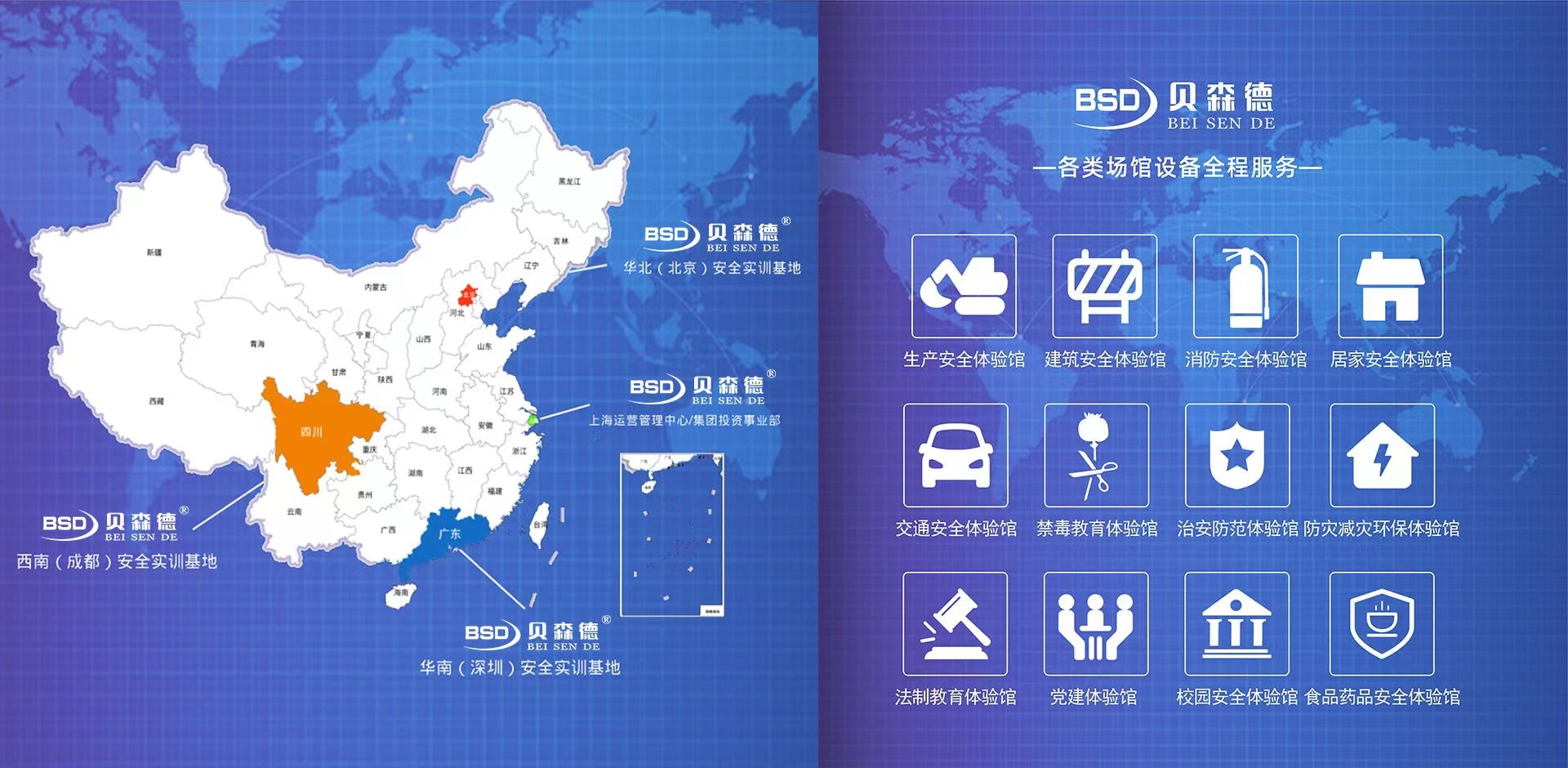 貝森德旗下有:貝森德、貝創科技、瓦令科技等品牌,主營業務由:體驗式教育服務、綠色環保服務等構成。 提供各類場館設備全程服務:消防體驗館、消防安全體驗館、生產安全體驗館、建筑安全體驗館、居家安全體驗館、交通安全體驗館、工地安全體驗館、VR安全體驗館、校園安全體驗館、食品藥品安全體驗館、安全教育體驗館、禁毒體驗館、禁毒教育體驗館、治安防范體驗館、防災減災體驗館、法制教育體驗館、黨建體驗館、模擬滅火體驗、安全體驗教室等。業務覆蓋全國,主要覆蓋上海、北京、深圳、四川成都、浙江、江蘇、云南等地。